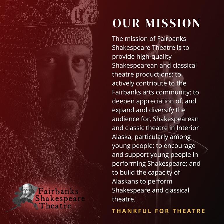 Fairbanks Shakespeare Theatre is supported in part by a Fairbanks Arts Association Regrant, the City of Fairbanks Bed Tax, The Richard L. and Diane M. Block Foundation, The Alaska Community Foundation, UAF Summer Sessions, the Rasmuson Foundation, Pick.Click.Give., Fred Meyer, The Golden Heart Community Foundation, Raven Landing, the Usibelli Foundation, the GVEA Good¢ents Program and Lotto Alaska.