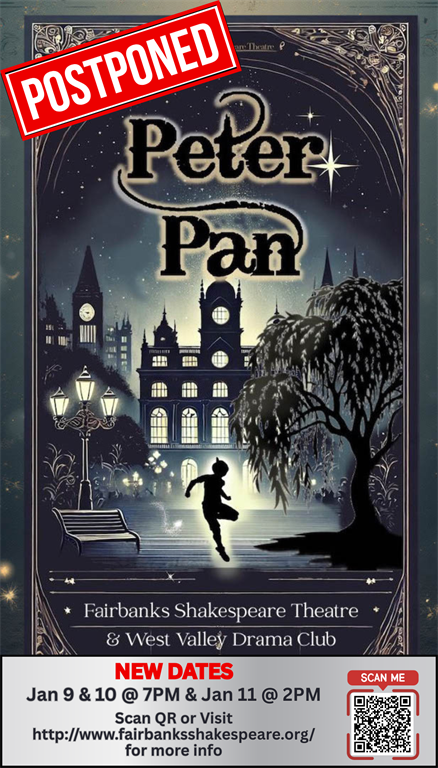 Peter Pan will be rescheduled for next weekend due to extreme weather conditions. To exchange or refund your tickets, please login to your reservation, and follow the recommended steps, contact info@fairbanksshakespeare.org, or simply present your reservation at the door.