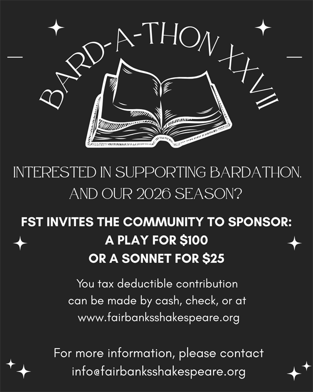 Donate Fairbanks Shakespeare Theatre depends on community support to fulfill its goals of bringing high-quality Shakespearean and classical theatre and theatre education to Interior Alaska. Please consider making a tax-deductible donation to aid us in this important mission.
